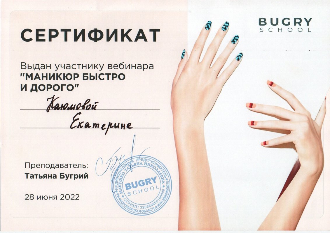 Здесь вы можете сделать маникюр. Аккуратные ногти - это та важная мелочь, которая привнесет в ваш облик завершенность и даст трудноуловимое, но такое важное для женщины ощущение изысканной элегантности. А если вы внимательны к последним веяниям моды, то для создания маникюра можно использовать актуальные в сезоне цвета и свежие сочетания оттенков - и превращать его каждый день во всегда уместный аксессуар! И неважно, какую из разновидностей маникюра вы хотите выбрать: практичный гель, сдержанный френч или скромный обрезной без покрытия, заботиться о внешнем виде своих рук это всегда хорошая идея, ведь это признак настоящей женственности.